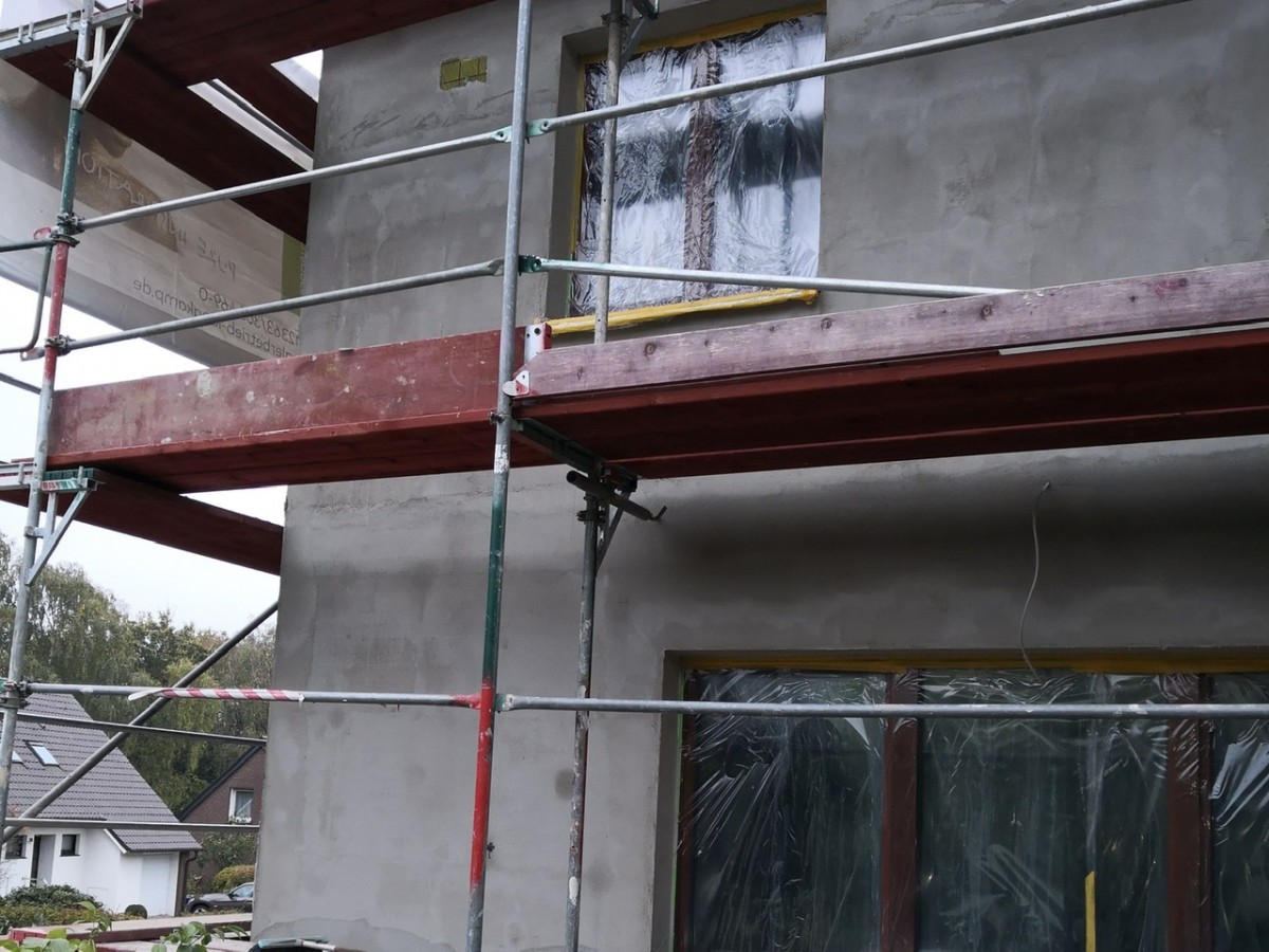 Nach der Sanierung zeigt sich das Einfamilienhaus in modernen Tönen mit Komplementärkontrast. Fenster und Türen wurden optisch in Szene gesetzt und verleihen der Fassade eine stilvolle und zugleich angenehm frische Nuance.