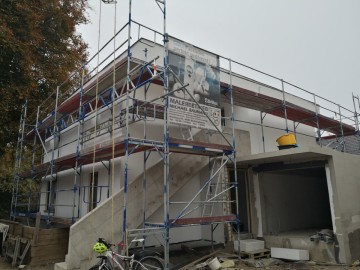 Nach nunmehr einem knappen Jahr notwendiger Bodenbewegung wächst das Gebäude auf tragfähigem Boden sicher nach oben und kann bereits jetzt mit der neuen Fassade überzeugen.